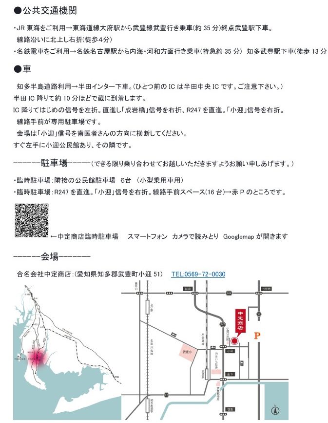 中定商店敷地内2台、専用駐車場16台(JR線沿い)、臨時駐車場6台(小迎公民館)です。
